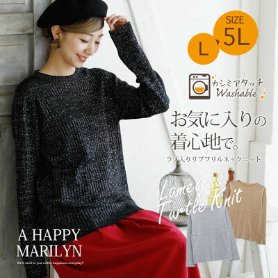 大きいサイズ レディース トップス | お家でも洗える! カシミヤタッチ 毛玉防止・静電気軽減 ラメ入り 長袖 リブフリルネックニット _ リブニット プルオーバー LL 3L 4L 5L 秋 秋物 秋冬 ぽっちゃり おしゃれ オシャレ かわいい カジュアル [225798/334322] OMMTO